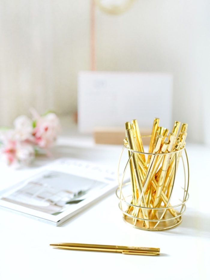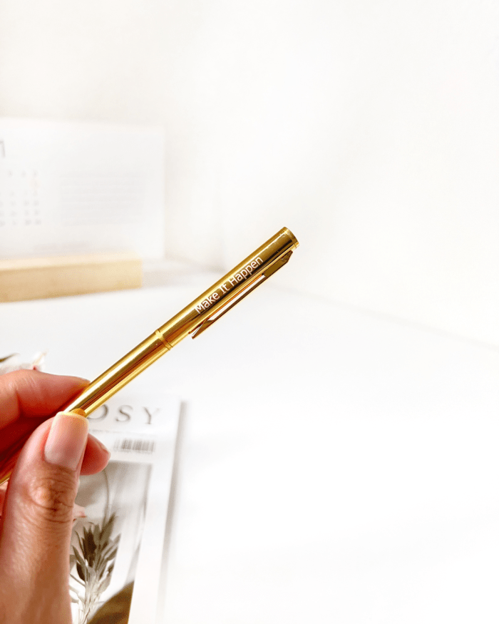 Características: Lapicero de tinta seca – Tiene grabado una frase inspiradora – Es completamente dorado lo que lo hace más elegante – Tinta seca 0.7mm